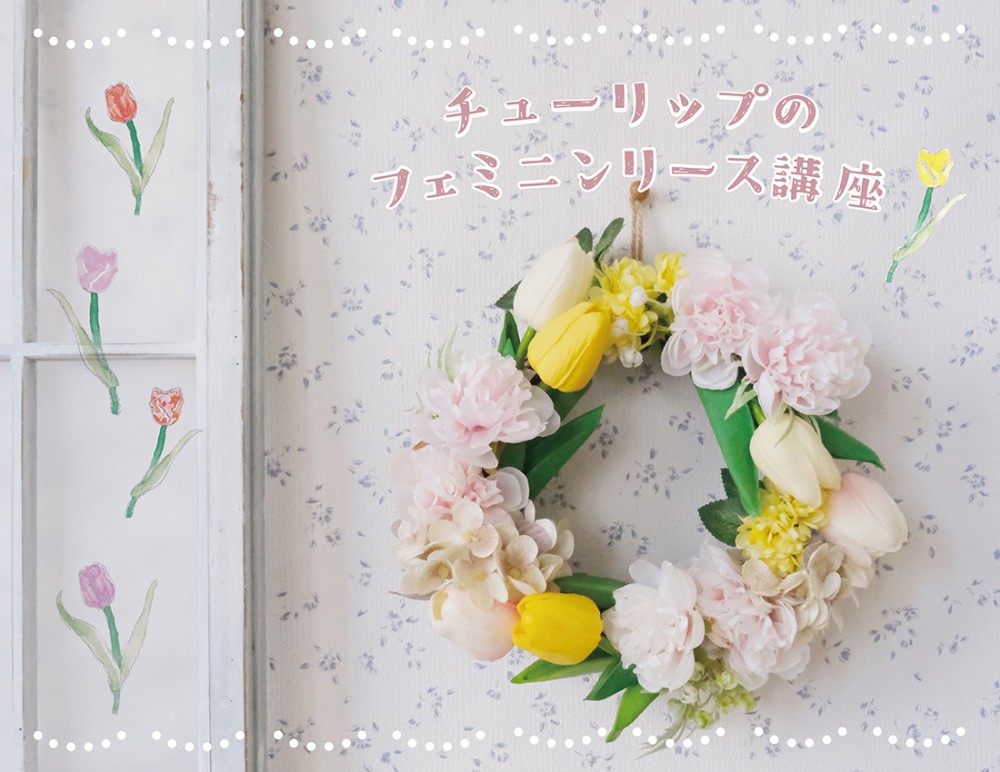 チューリップを贅沢にあしらった春色リース。この季節ならではのリース作りにぜひご参加ください。