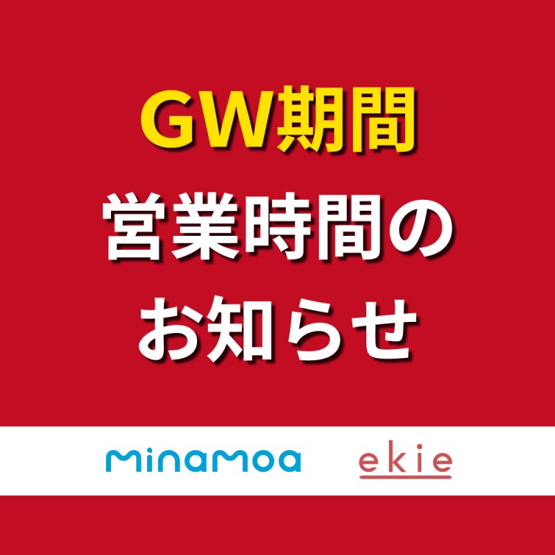 2026.04.24 minamoa ekie GW期間 minamoa・ekie営業時間のお知らせ GW期間中ミナモア・ekieの一部店舗はいつもより少し早めにOPEN 早めのランチやショッピングに是非ご利用ください ekie 早開け店舗 飲食店舗 5/2(土)~5/6(水祝)・5/9(土)~5/10(日) 10:30 OPEN ◎1F ekie DINING みっちゃん総本店/お好み焼き 麗ちゃん/お好み焼き むさし/むすび・うどん 中華そば 我馬/ラーメン くにまつ+武蔵坊/汁なし担担麺 海賊料理と牡蠣の店 村上海賊/海鮮居酒屋 ※5/2(土)~5/6(水祝)のみ ◎2F エキエバル ひろしまギョウザ/餃子バル 食品店舗 5/2(土)~5/6(水祝)・5/9(土)~5/10(日) 9:00 OPEN ◎1F ekie KITCHEN 元祖揚げもみじ もみじ堂/揚げもみじ・ドーナツ ※5/2(土)~5/6(水祝) 8:00 OPEN ナンバーエイト/ 弁当・惣菜 minamoa 早開け店舗 5/2(土)~5/6(水祝) 9:00 OPEN ◎2F西 カンナムキンパ/韓国総菜 BACK