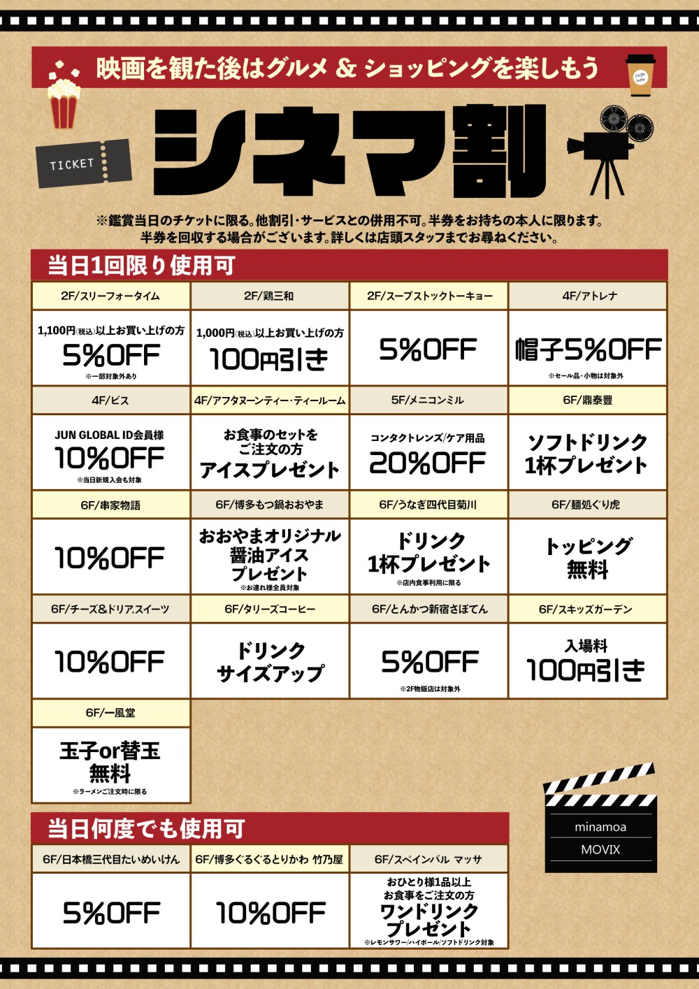 MOVIX広島駅で映画を観た後も、ミナモアでグルメ&ショッピングをお得に楽しめる店舗が盛りだくさん♪対象店舗にて半券をご提示ください。ぜひミナモアを楽しみ尽くそう!