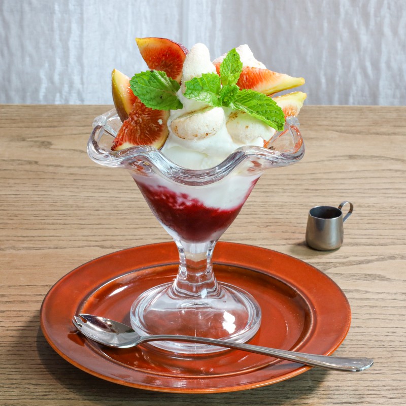 いちじくとジェラートにカリカリのメレンゲをのせ赤ワインの風味を加えた大人のパフェ
