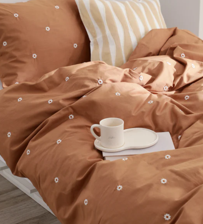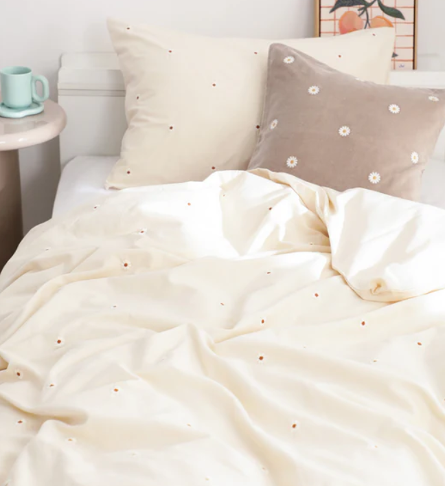 コットン100%のやわらかな生地に、デイジーモチーフを刺繍した寝具カバーです🌷🐑