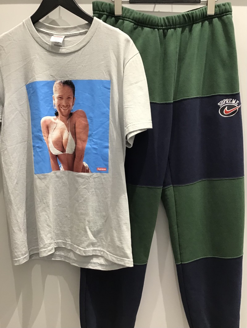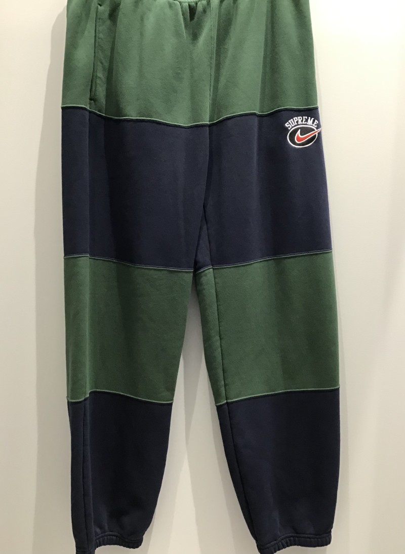 2点目はナイキとのコラボのボーダースウェットパンツになります!グリーンとネイビーの太めのボーダーになっており、左腿にはナイキとsupreme の刺繍が施されています!ウエストには紐がついておりますので、サイズ調節は簡単にしていただくことが可能です!これから秋冬に向けてスウェットパンツなのでラフに履いていただけますし、先ほどご紹介したTシャツとの合わせもおすすめです!私的には、ニットやコートなど上品なアイテムに合わせて靴はローファーで締めてあげるスタイルがとてもかっこいいと思います!