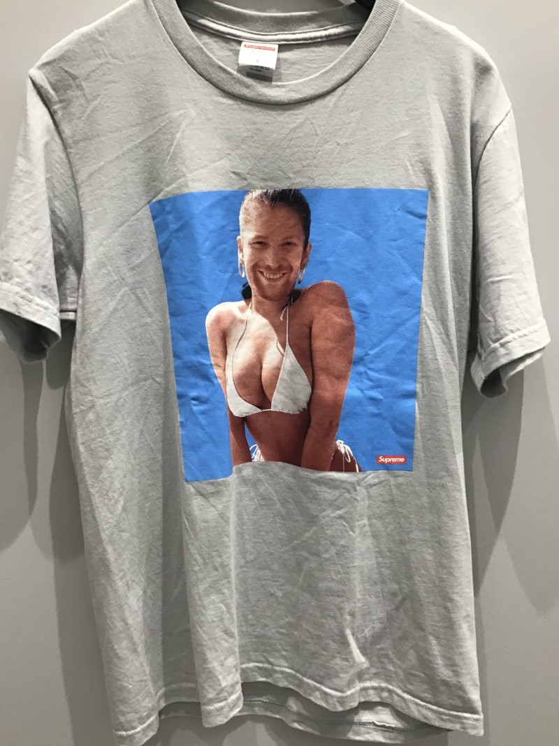 1点目はライトグレーのTシャツになります!Aphex Twinというイギリスの有名なミュージシャンとのコラボになります!インパクトのある大胆なフォトプリントがフロントに配置されています。またフォトの右下にはsupreme とロゴが入っており、ブランドらしい遊び心とストリート感があります!1枚で主役になる存在感抜群のTシャツなので、まだまだ暑いので今から着ていただけますし、これから寒くなってくるとシャツやジャケットのインナーに着てあげてギャップを楽しむ着方もおすすめです!