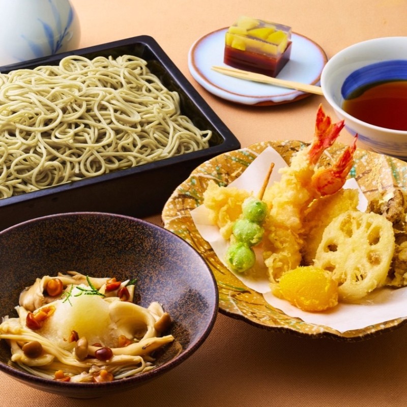 きのこおろしそば・海老と秋野菜の天ぷら盛り合わせ・そば粉とこしあんで作った栗のそばようかん付