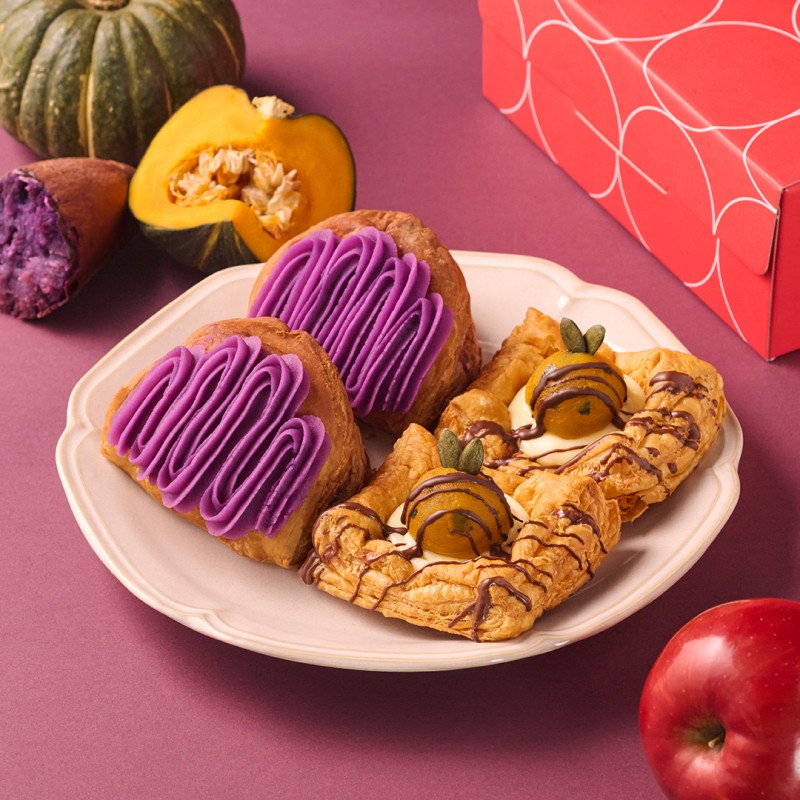 RINGO人気No.1のアップルパイに紫いもあんペーストをあしらったサクサクしっとり食感のコントラストを楽しめる「焼きたてカスタードアップルパイ 紫いも」と、ハロウィンを象徴する「かぼちゃ」をモチーフに見た目も可愛いく仕立てた「焼きたてオープンパイ〔パンプキン〕」がセットになって登場。秋の味覚をこのパンプキンセットでご堪能下さい。