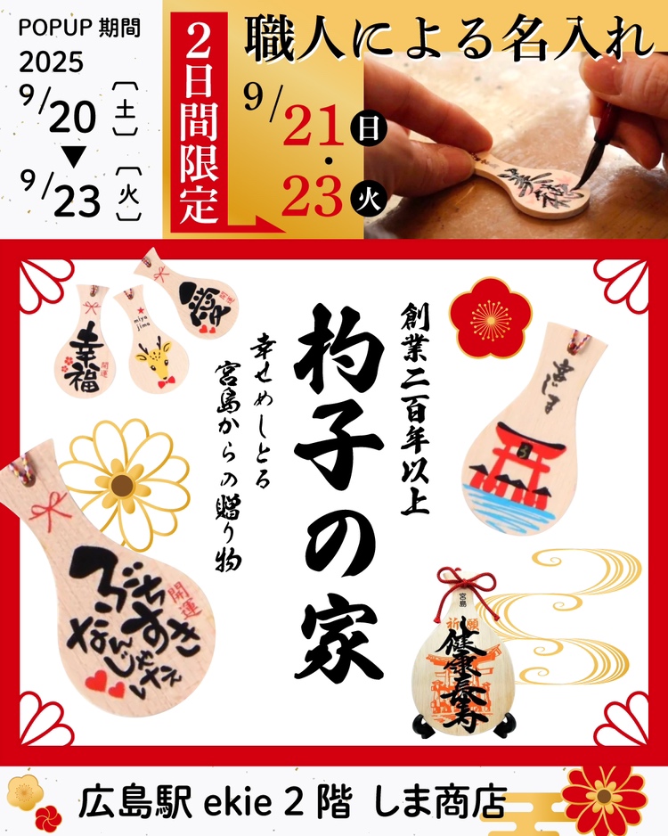 宮島の伝統工芸品であるしゃもじの製造販売を行なっている杓子の家では、しゃもじにオリジナルの手書き文字を入れるサービスが人気となっています。