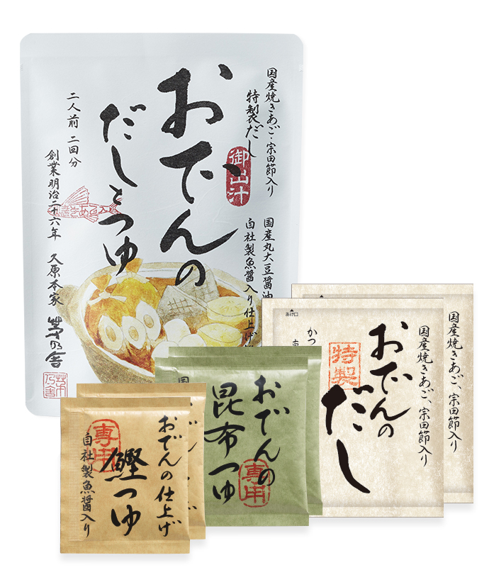 ご家庭でもおいしいおでんを手軽につくれる「三つの調味」がセットになったおでんの素です。