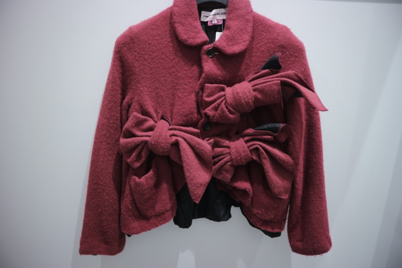 1点目は縮絨加工がかかったジャケットになります!こちらはコムデギャルソンが得意としている縮絨加工で、こちらはウールに摩擦や圧力をかけて肉厚でしっかりとした風合いがあります!また、ジャケットの前身頃にはリボンがついていて可愛らしいデザインになっています!こういった装飾をつけるのも得意としています!合わせ方としては、コムデギャルソンらしくスカートを履いてあわせてあげてもいいし、シンプルにデニムと合わせてもおすすめです!