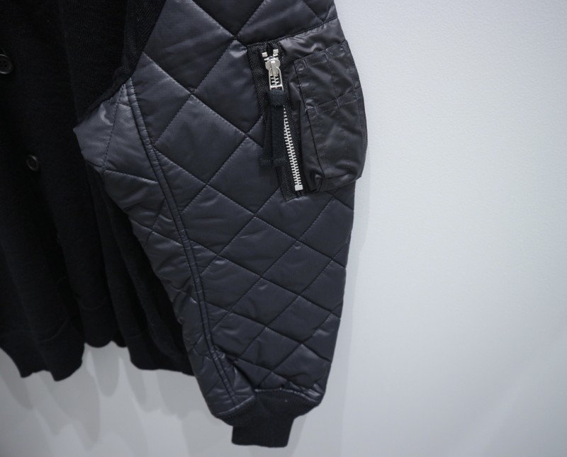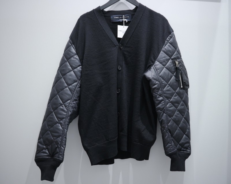 2点目はカーディガンになります!一見シンプルに見えるカーディガンですが、袖の部分がキルティングの切り替えになっています!また、左の袖にはチャックがついており、リブもついているのでMA1を彷彿とさせるようなデザインになっています!こういった切り替えだったり、裾をリブにしているところがコムデギャルソンらしいです!カーディガンなのでこれからの季節にとてもおすすめです!色味も黒なので、ベーシックなアイテムとも相性がいいです!