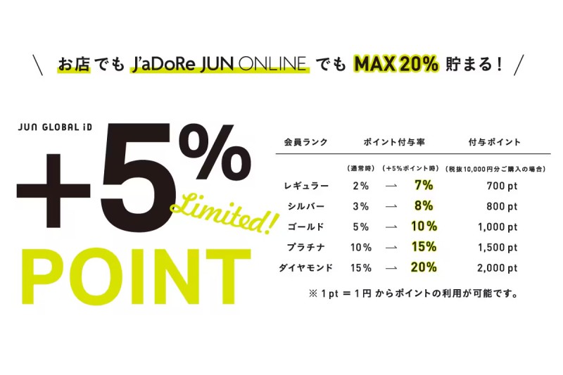 2025.10.06 - JUN GROUP POINT UP CAMPAIGN - +5%ポイントアップキャンペーン開催! 10月10日(金) 0:00~13日(月祝) 23:59の期間中、通常商品のお買い上げ金額と会員ランクに応じて、JUN GLOBAL IDポイントをプラス5%プレゼント! お得なこの機会にぜひ秋物のお買い物お楽しみ下さい♡ VIS ビス カテゴリー ファッション 業態 レディスファッション フロア minamoa 4F ファッション MAP 電話番号 082-258-6890 営業時間 10:00~20:00 ショップ詳細 BACK