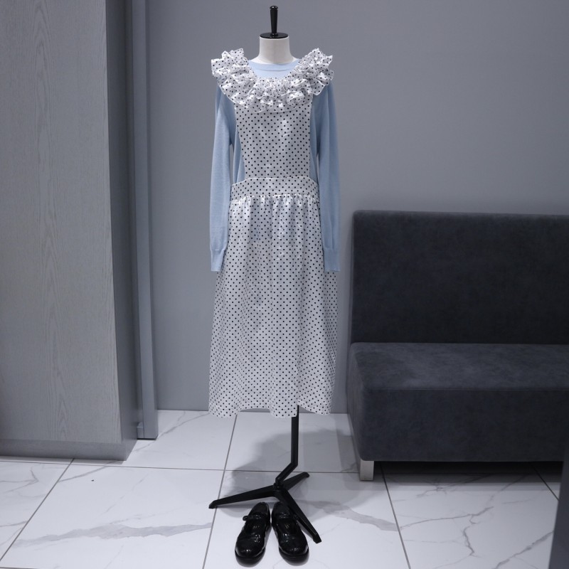 2点目はCOMME des GARÇONSの水色のセーターです。高級感のあるジャンパースカートにセーターを合わせることでカジュアルな雰囲気になりました。トーンを合わせることでコーデにまとまりがでます。
