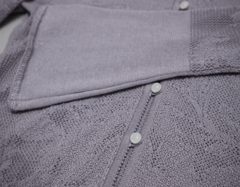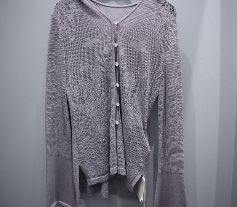 繊細な編み模様や袖口の広がり、光沢のあるくるみボタンなど、女性らしさを引き立てるデザインがまさにMame Kurogouchiのブランドイメージにぴったりです。