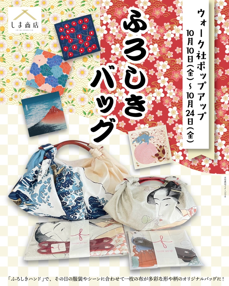 通常取扱のある商品に加え、尾道カラー帆布のふろしきショルダーや、浮世絵柄の商品など、POP UP限定で取り扱う商品もございます。