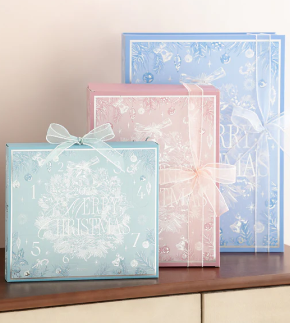 昨年よりデザインを刷新し、パウダリーなパステルカラーと雪のようなキラキラ輝くリボンをあしらい、よりクリスマスらしいルームコーディネートを楽しめるデザインにアップデートされています🎀