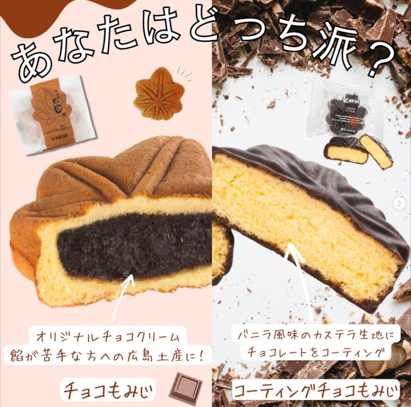 もみじ饅頭に合うオリジナルチョコクリームを使用しています。若者にも、お子様にも大変喜ばれる味わいになっています。