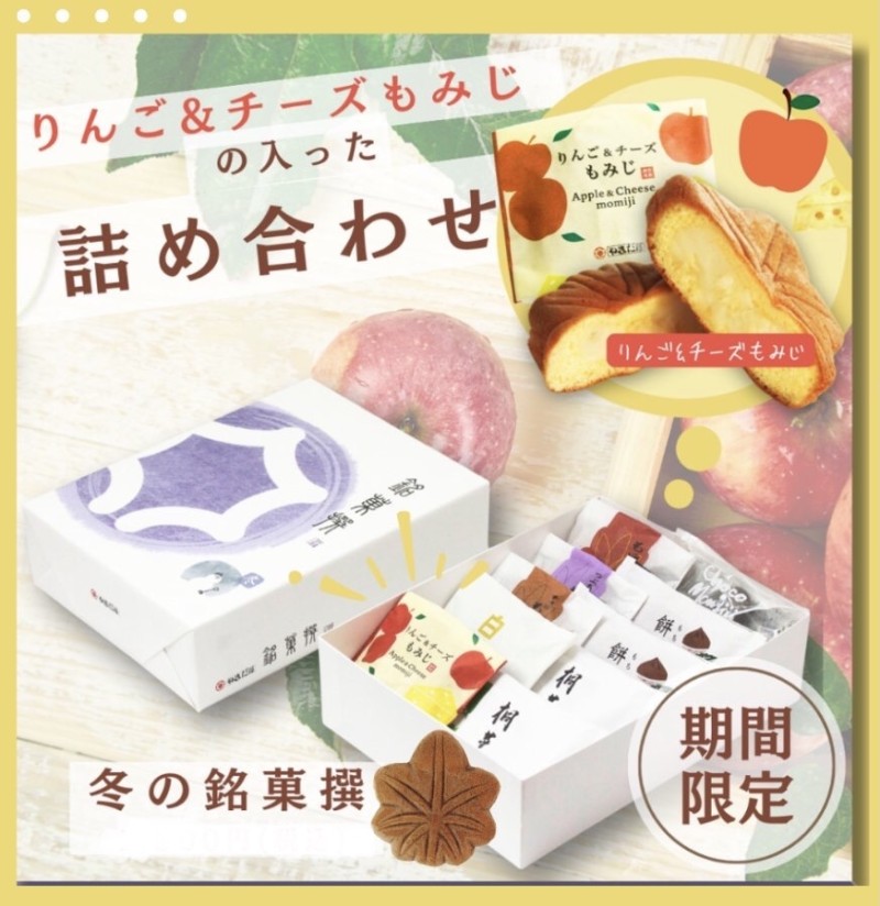 桐葉菓2個・餅栗2個・コーティングチョコもみじ1個 ・もみじ饅頭(こしあん)1個・つぶあんもみじ1個・チョコもみじ1個・白もみじ1個・りんご&チーズもみじ1個