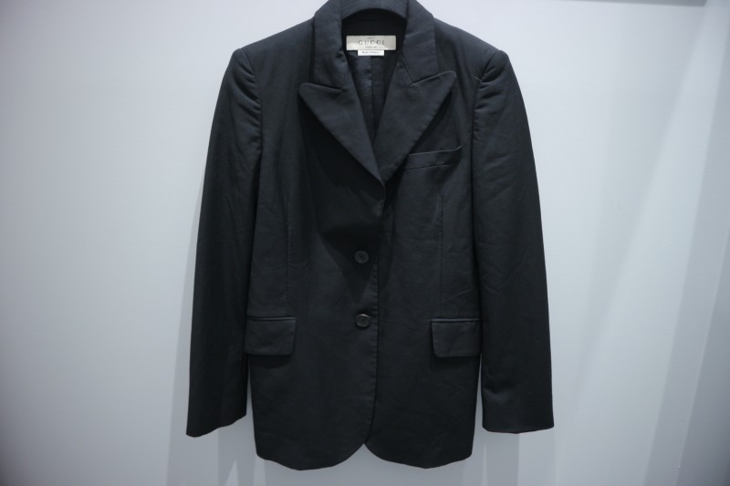 1点目はGUCCIの上質な仕立てが際立つテーラードジャケットです。一見シンプルながらも、シルエットや素材、細部のカッティングにブランドのこだわりが光る1着です。また、柔らかく滑らかな質感ながらも適度なハリと光沢があり、とても高級感があります。スタイリングの提案として、白シャツやタートルネックニットをインナーに合わせ、スラックスやレザーシューズを合わせて、ラグジュアリーなフォーマルスタイルや、デニムやチノパンを履いてカジュアルダウンさせたスタイリングもおすすめです!また、スカートと合わせてモードに合わせてもかっこいいです!