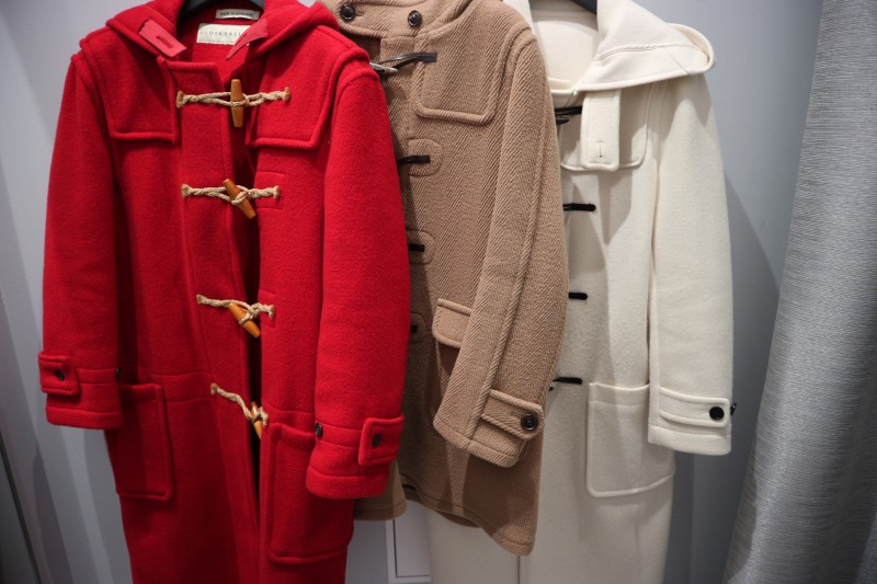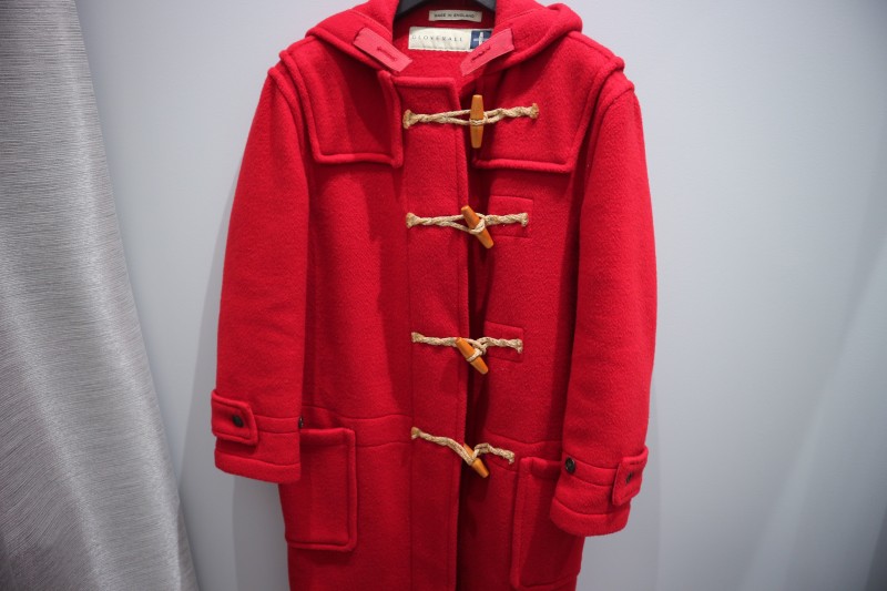 1点目は、GLOVER ALLの赤いダッフルコートです。GLOVER ALLは英国発祥の言わずと知れたダッフルコートの代名詞的ブランドですね。