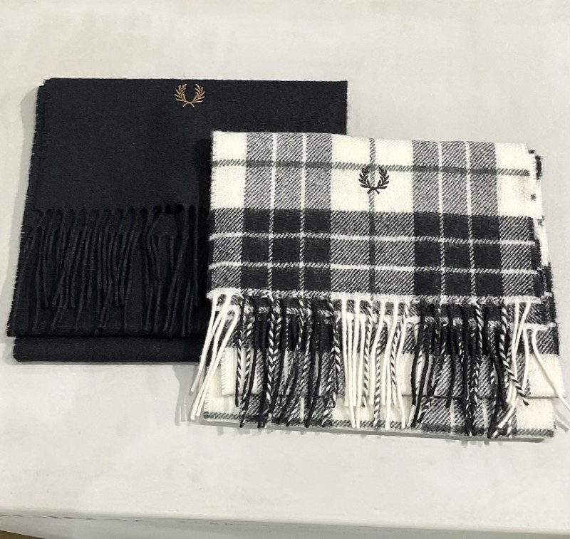 1枚目は、ラムウールを使用したタータンチェックマフラーです!ラムウールは保温性が高く、チクチクしにくい柔らかい肌触りです!フリンジとローレルリースの刺繍が施されています!