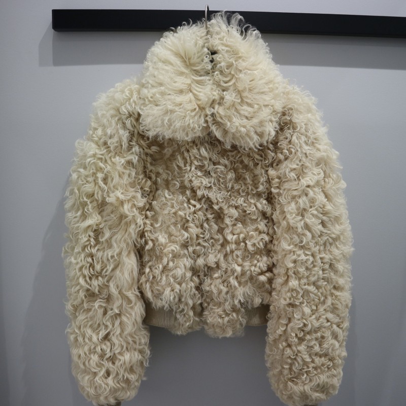クリーム色でクルクルしているファーが可愛らしいアイテムです。