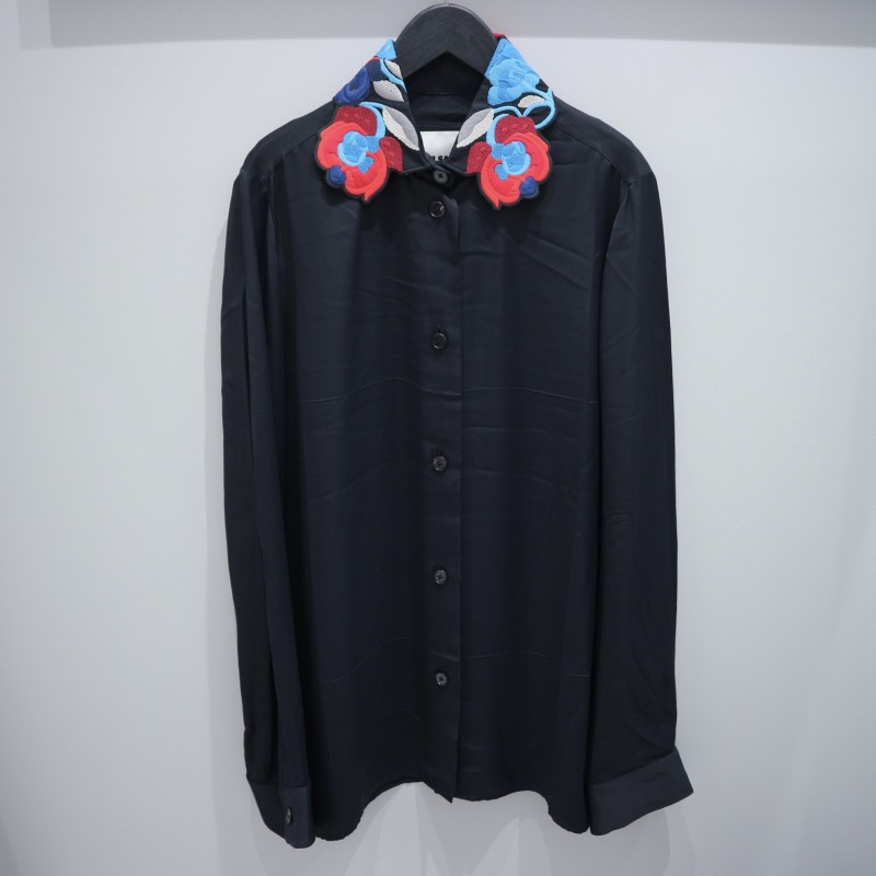 シンプルなデザインのブラウスですが、襟には鮮やかな花柄の刺繍が施されており、全体的に華やかな印象のアイテムです。サラッとした質感で光沢感のある生地が高級感を引き出してくれます。
