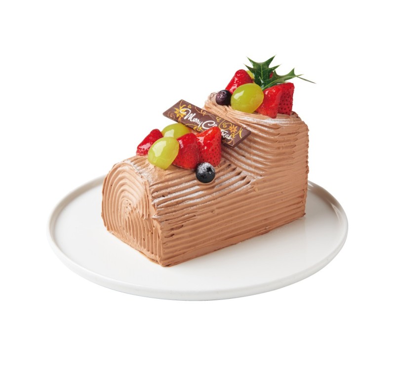 チョコクリームにナッツがアクセントのしっとりロールケーキ。苺とシャインマスカットで飾ったブッシュ・ド・ノエル。