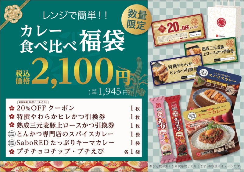 20%OFFクーポン1枚、特選やわらかヒレかつ引換券1枚、熟成三元麦豚上ロースかつ引換券1枚、とんかつ専門店のスパイスカレー1袋、SaboREDたっぷりキーマカレー1袋、プチチョコチップ1袋、プチえび1袋