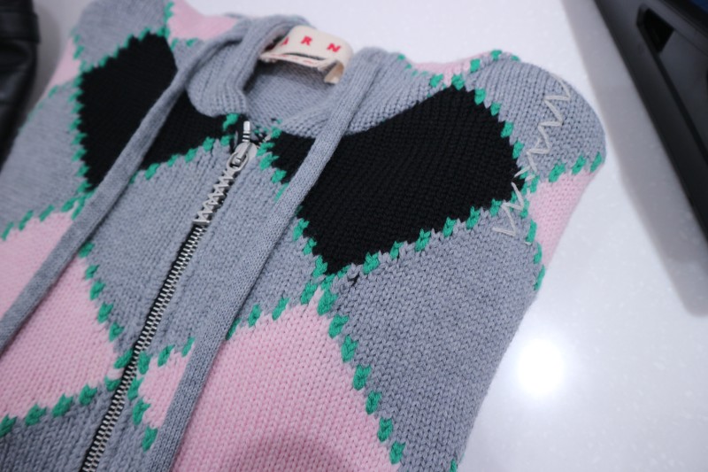 グレー×ピンク×黒のアーガイル柄に、緑色のステッチのような柄が施されており、MARNIらしい配色のアイテムです。左肩の部分やフロントのファスナーにはブランド名も入っており、MARNI好きにはたまらない一品ですね。