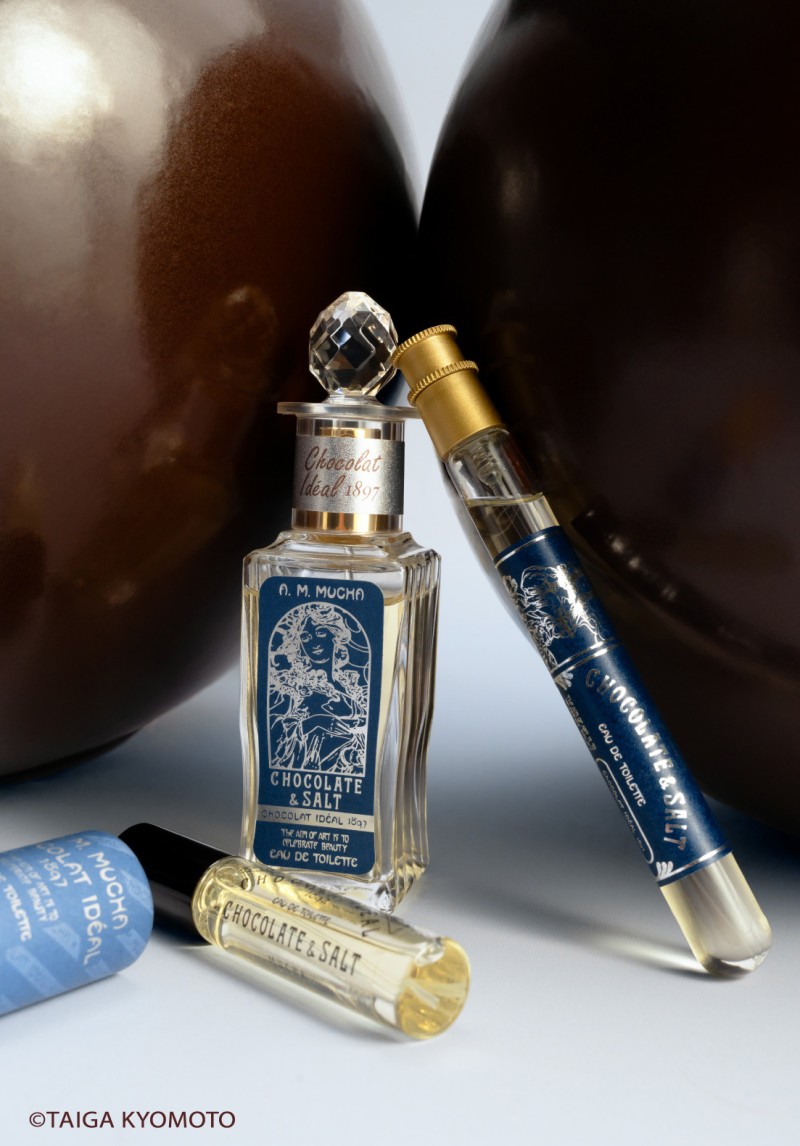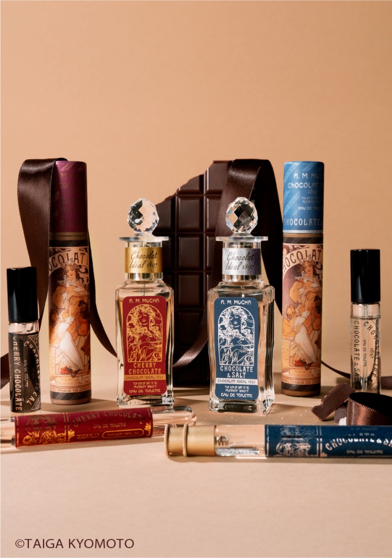 19世紀末のパリの生活を色彩豊かに描いたミュシャのインスタント・ココアのポスター 『ショコラ・イデアル』から登場するふたつのフレグランスを 唯一無二の感性が光るビジュアルと共にお届けします。