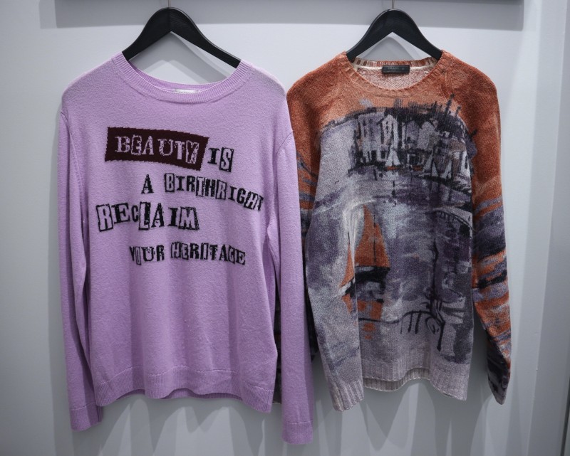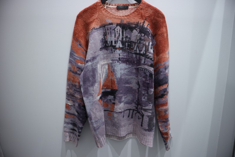 2点目はPRADAのでデザインが入ったニットになります。先程のVALENTINOとは違って背面にもデザインが入っております!肩周りにはブラウンが入っており、少し暖かみを感じながら中心辺りは紫や水色を使っており、少しミステリー感を感じさせるニットです!