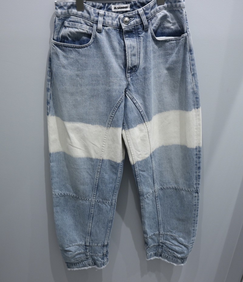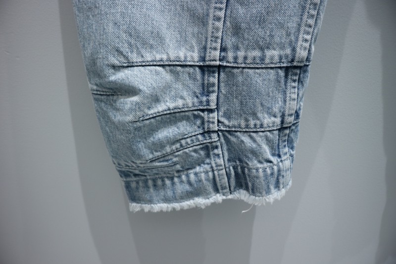 腿の辺りに白いペンキが塗られたデザインが入ってます。また立体裁断になっていますので、動きやすく作られているかつ通常のデニムにはない独特なシルエットが生まれているのでとてもおもしろいデニムです。裾はカットオフになっており、遊びが効いてます。こちらもフリースと同様にデザインが効いてますので、シンプルなニットやスウェットで合わせてあげるのがおすすめです。アウターは先程のフリースを合わせてもいいし、ミドル丈のコートを着て白く塗られているデザインを見せる着方もおすすめです!