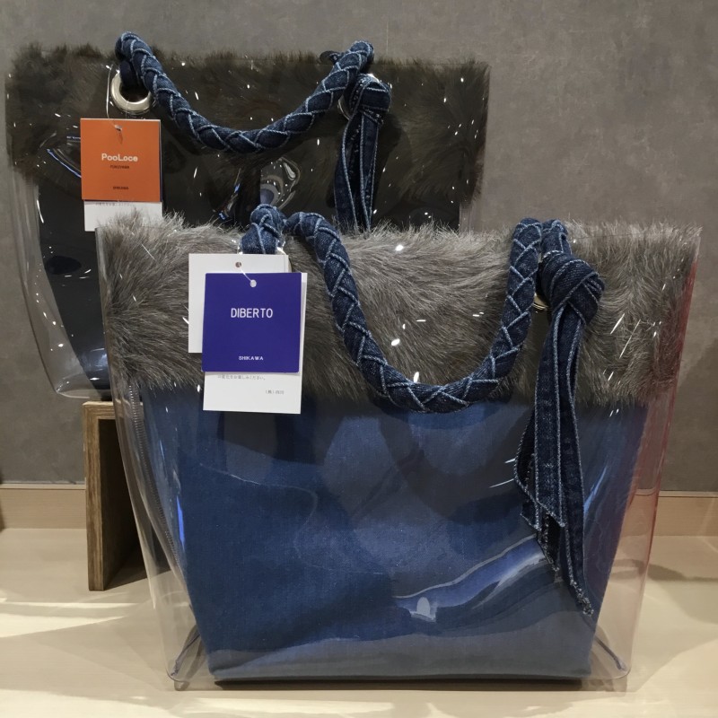 春夏に人気のあるクリアバッグの秋冬バージョンが登場。ファーがついて温かみのあるタイプです。また、エコな商品で、ジーンズのデニムループを持ち手とバッグチャームに利用しています。