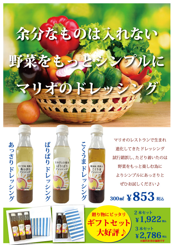 マリオのレストランで生まれ進化してきたドレッシング 試行錯誤し、たどり着いたのは野菜をもっと楽しむ為にシンプルにあっさりと ぜひお試しください♪