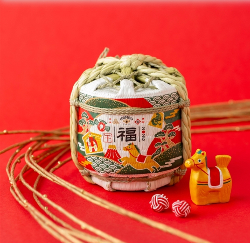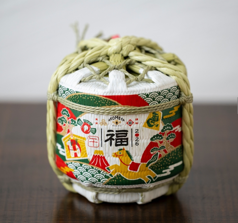 2026年の干支、午のアートをあしらった華やかな帯の巻かれた菰樽の日本酒。