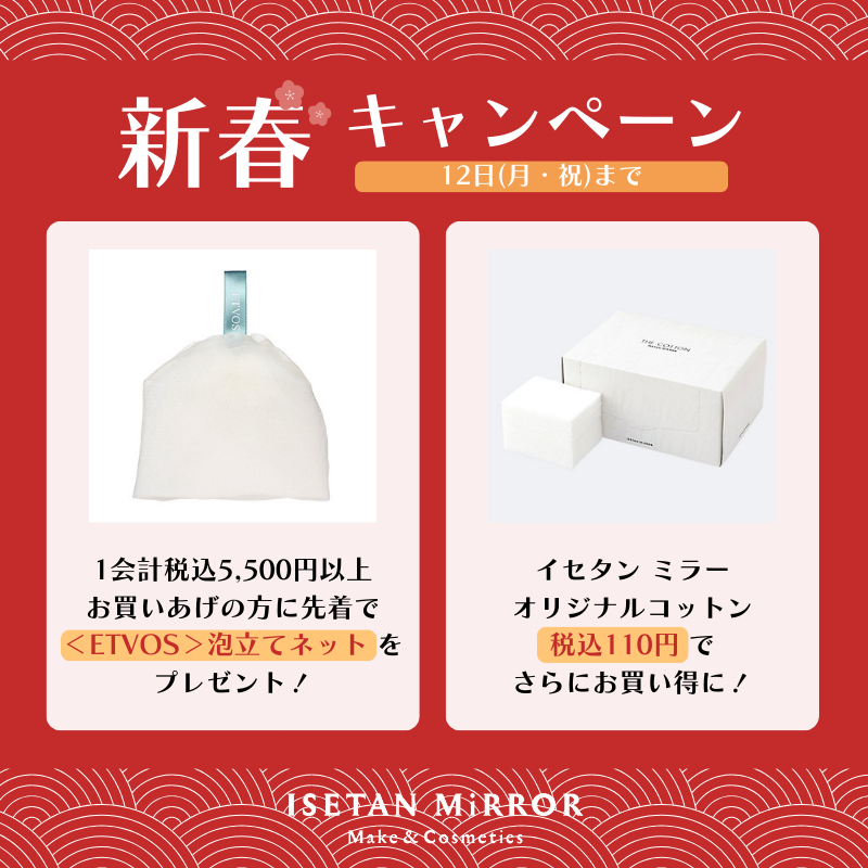 1月3日(金)~12(月・祝)の期間中、三越伊勢丹アプリにてイセタン ミラーをお気に入り店舗選択・該当クーポンをご呈示の上、一回のお会計で税込合計5,500円以上お買いあげのお客さまに先着で<ETVOS>泡立てネットを差し上げます。