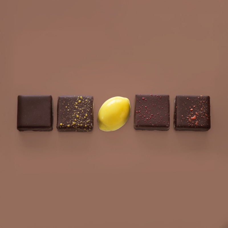 藤い屋が唯一無二の味を求めて作ったチョコレートでコーティングしました。「オリジナル」「キャラメルレモン」「紅茶」「レモンと杓子せんべい」「フランボワーズ」5種類のチョコレートの味をご堪能ください。
