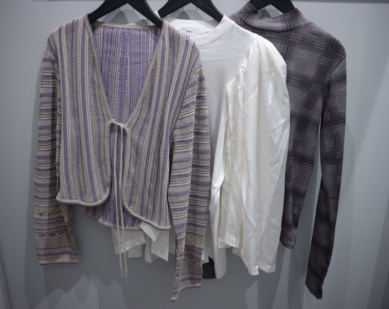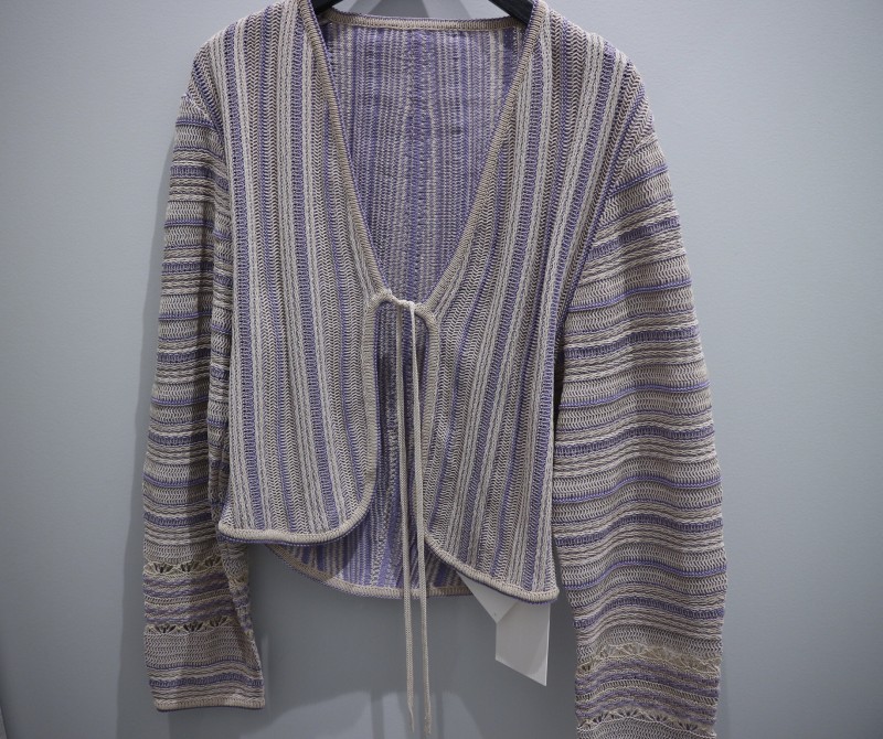 黄色と紫の淡い色彩や曲線的なシルエットが、まさにこのブランドらしいアイテムです!紐で開閉するフロントが、着物の羽織を彷彿とさせるデザインですね。
