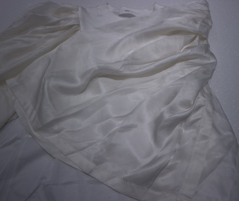 アウターを着ていれば一見普通の白シャツですが、大きく広がったスリーブが特徴的なアイテムです。スリーブは光沢感のあるキュプラ製となっており、異素材を組み合わせたドレープ感のあるデザインがTOGAの世界観を表していますね。