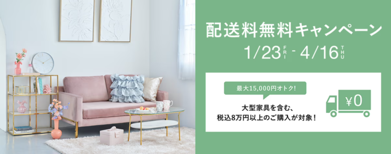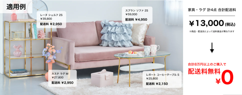 大型家具・ラグも!合計8万円以上のご購入で配送料が無料!