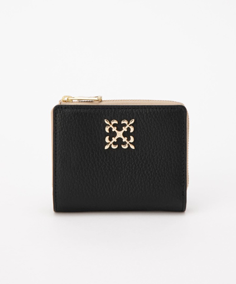 モノグラムプレートがデザインのアクセントになった、上品な印象の折財布。外装と内装の色が異なるバイカラーで、遊び心ある仕上がりに。