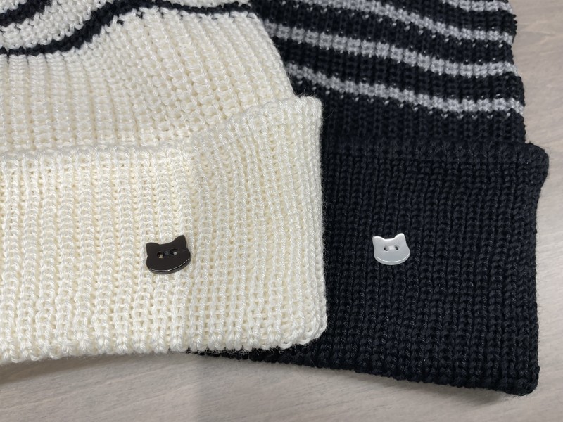 ニット帽に付けられた、猫の形をした可愛いボタンが帽子にアクセントを加えています。