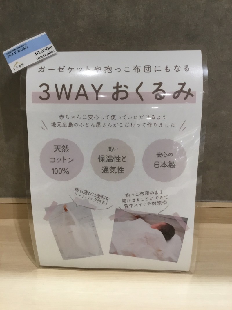 持ち運びに便利なトートバッグ付きでお出かけ時の必須アイテムも一緒に入れることができます。抱っこ布団のまま寝かせることができて寝かしつけにぴったりのアイテムです。ご興味のある方は是非しま商店にお越しくださいませ。