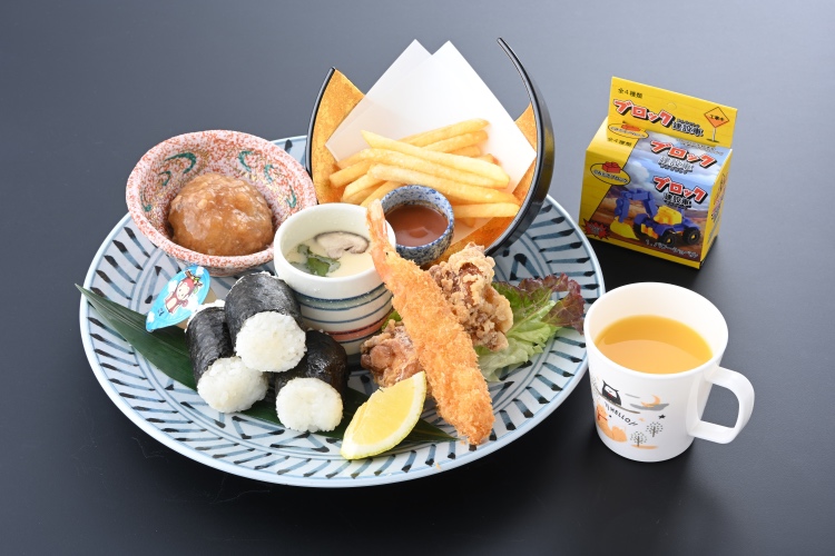 海老フライ、ハンバーグ、鶏唐揚げ、ポテト、茶碗蒸し、おむすび、ゼリー、ジュース、おもちゃ付