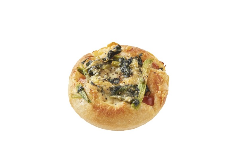 じゃがいも入りのファーマーズ生地に、バターフィリングと和えたほうれん草、ソーセージ、ミックスチーズを組み合わせました。