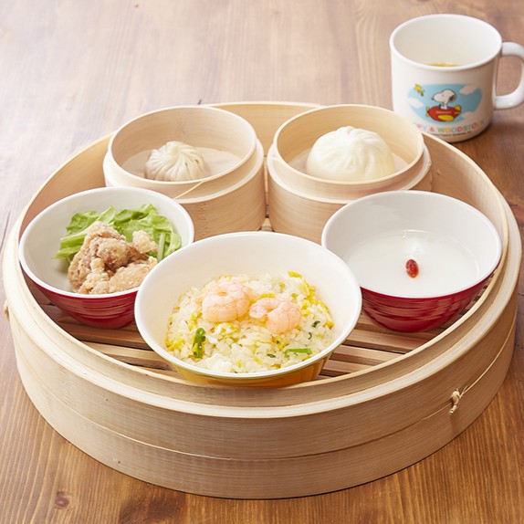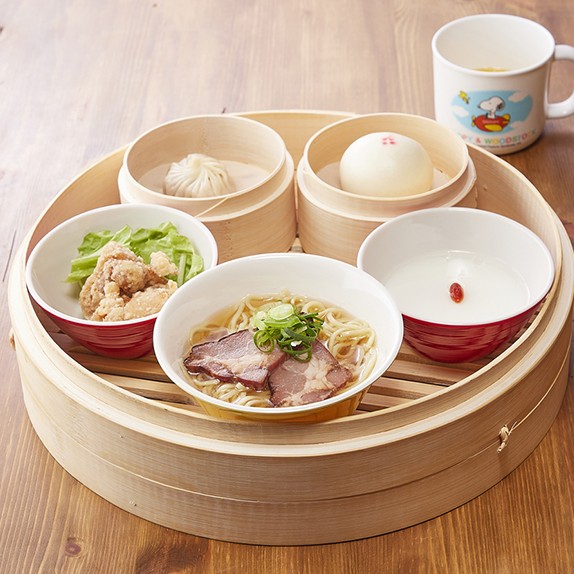 唐揚げ、小籠包1粒、饅頭、杏仁豆腐、麺orチャーハンの入ったセットです。