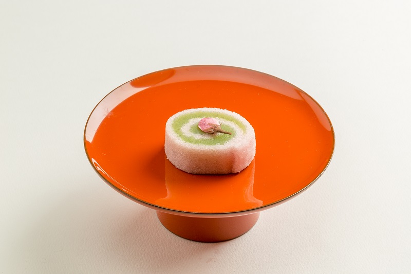 ふんわりとした軽羹で桜葉を加えた緑の羊羹を巻きあげました