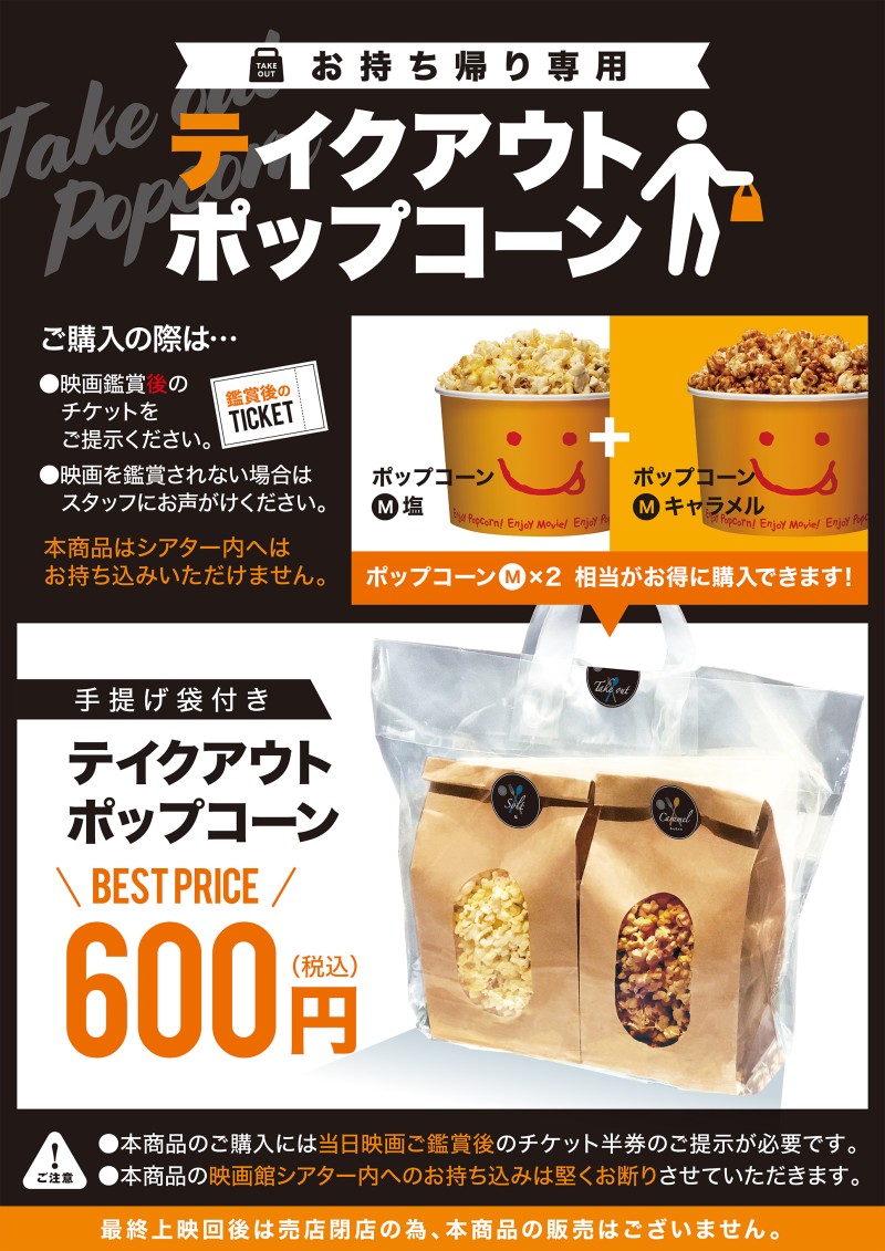 2026.03.20 NEW テイクアウトポップコーン 600円 塩とキャラメルMサイズ相当のポップコーンがお得に購入いただけるお持ち帰り専用ポップコーンです。 MOVIX広島駅 ムービックスヒロシマエキ カテゴリー エンタメ& カルチャー 業態 シネマコンプレックス フロア minamoa 7F ホテル・シネマ・ウッドデッキ広場 MAP 電話番号 営業時間 9:00~23:00( 時期・上映作品によって異なります ) URL 公式サイト ショップ詳細 BACK