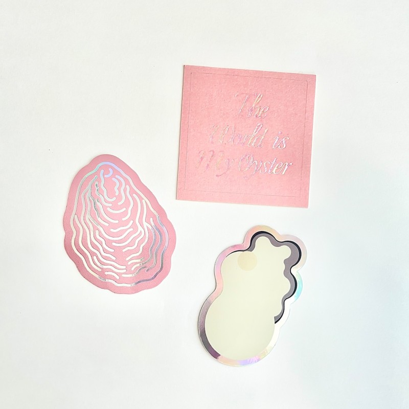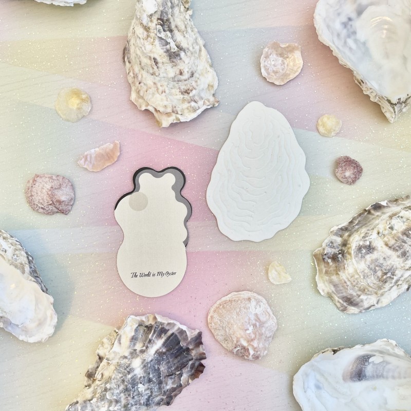 コインやカードを入れられるマルチケース、牡蠣の殻入りのリサイクルペーパーのミニカード2枚セット、オイスターを惑星“スター”に見立てたプリントがあしらわれたマルシェバッグ。カラーはピンクとベージュの2色展開です。