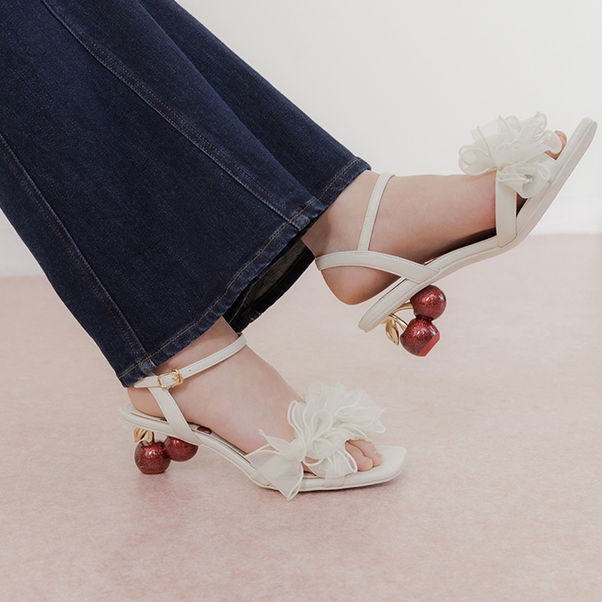 遊び心たっぷりのアイコニックなチェリーヒールが目を惹くストラップサンダル。
