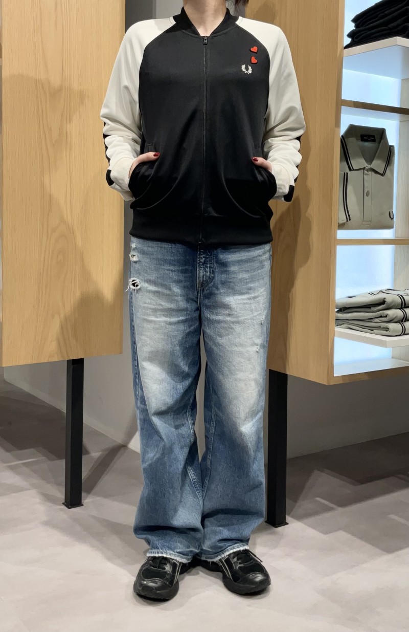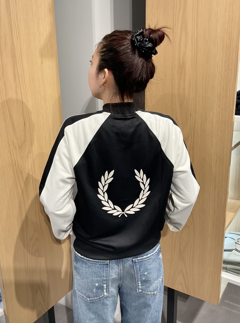 ローレルリースを背面にフロッキープリントしたテニスボマージャケット!落ち感のある素材を使った柔らかなシルエットになっています!✨エイミーの象徴的なブラックスタイルを基調に、モノトーンで統一しており、派手さを抑えながらもディテールで個性を表現するスタイルが特徴的です❤️